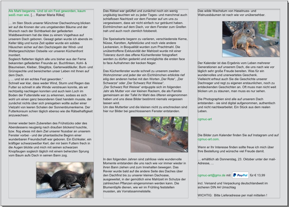 Von diesem Zeitpunkt an habe ich mit der Umsetzung meines Projektes begonnen und in diesem Zuge das Leben der Eichhörnchen auf den Dächern der Stadt in einem neuen Licht betrachtet. Das Ergebnis zeigen meine authentischen Bilder. Der Druck erfolgt Klimaneutral und unterstützt ein Aufforstungsprogramm im Allgäuer Voralpenraum.